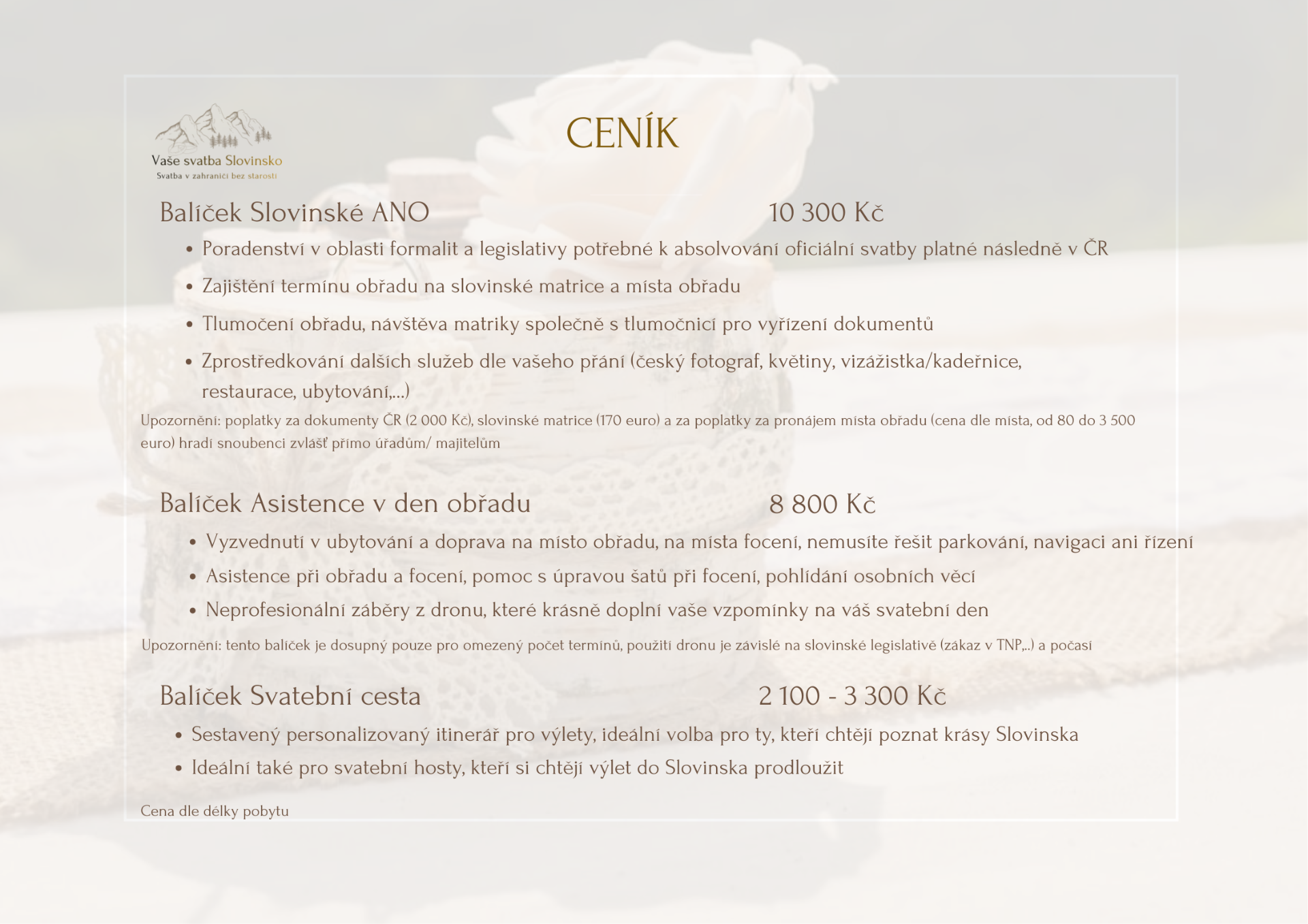 a koordinátorům zabývajícím se svatbami v zahraničí příznivé a cenově dostupné. Nemám ráda webové stránky, kde jsou ceny pouze na dotaz nebo kde jsou ceny balíčku přesně dané, ať je pronájem místa za tisíce či desetitisíce. Proto jsem se rozhodla jít v tomto svojí cestou a být pokud možno více transparentní a tam, kde to lze, mít ceny přímo uvedené .